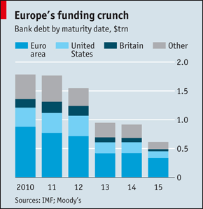 Conséquence des effets de crise et du passage quasi obligé par la BCE les Banques Européennes ont du emprunter plus « court », ce qui a réduit la maturité de leur dette….Cela induira de manière quasi mécanique un besoin important et très spécifique de refinancement des banques européennes dans les années qui viennent.