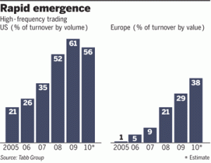 Des News de nos amis les machines : Selon le FT le trading à hautes fréquences représente désormais 56% des échanges aux US et 38% en Europe