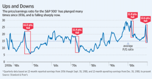 Dans le WSJ d’aout1o ce graphique montrant l’évolution du PER américains (S&P 500) sur longue période et au travers de plusieurs crises