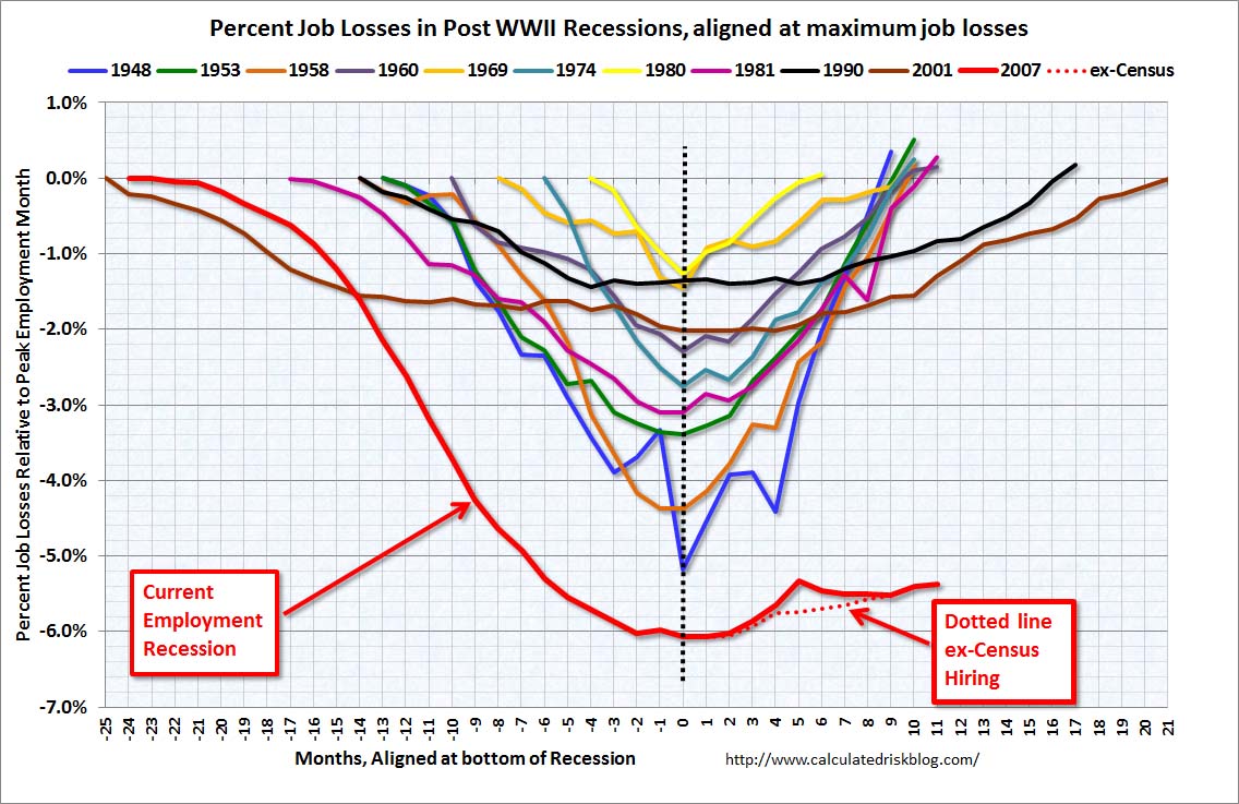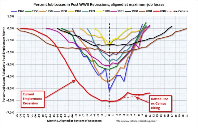 Le graphique suivant, qui présente l’évolution du taux de pertes d’emploi au cours de toutes les récessions américaines depuis 1948, se passe de tout commentaire