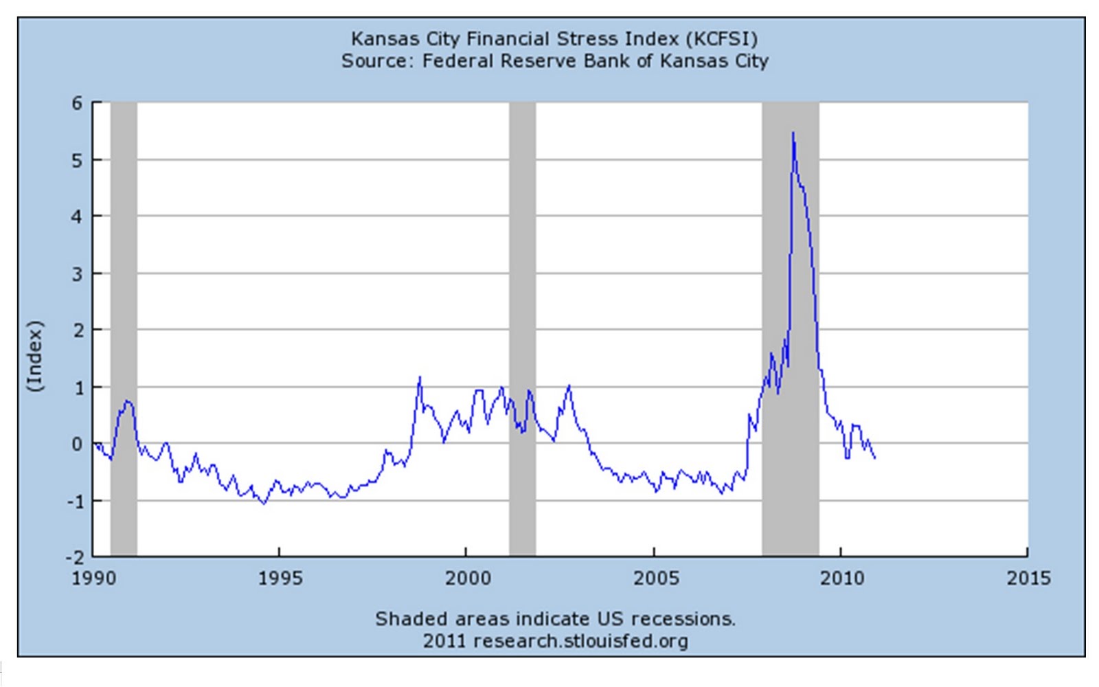 Le Kansas City stress financier Index (KCFSI) est une mesure mensuelle du stress dans le système financier américain basé sur 11 variables sur les marchés financiers.