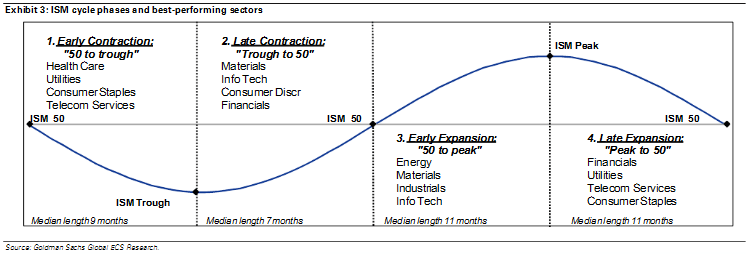 Pour cela on utilisera l’Indicateur ISM au dessus de 50 en période d’expansion, en dessous de 50 en période de récession. Et on effectuera une rotation sectorielle comme indiqué dans le graph de GS qui suit