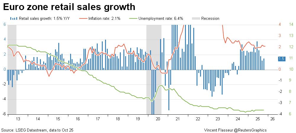 Parmi les pays pour lesquels des données sont disponibles, les plus fortes baisses ont été enregistrées au Portugal (-3,7%), en Slovénie (-2,1%) et en Espagne (-1,7%). En France, les ventes de détail ont diminué de 0,6% par rapport à août. Dans l’ensemble de l’Union européenne, elles ont reculé de 0,3% sur un mois et de 0,8% sur un an.