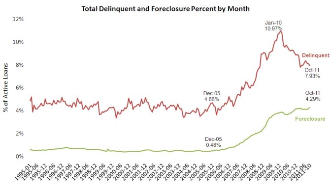 Le taux de délinquance totale a chuté à 7,93% depuis le sommet en Janvier 2010 de 10,97%. Un taux normal serait dans une fourchette de 4% à 5%, donc il reste un long chemin à parcourir avant une vraie amélioration de l’immobilier américain. Plus inquiétant encore le taux d’incident de paiement sur les hypothèques atteint des niveaux records à 4,29%. Et Il ya un grand nombre de prêts rentrant dans cette catégorie (Représentant environ 2,21 millions d’euros) – et le nombre moyen de jours depuis le dernier paiement pour les prêts en souffrance a atteint un nouveau record de 631 jours en Octobre….