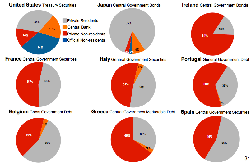 Les Agences, si on les suit, critiquent et déplorent que la BCE refuse de jouer le rôle de prêteur de dernier ressort, c’est à dire, tenez-vous bien, ils déplorent que la BCE se refuse à monétiser, à prendre le risque d’inflater les dettes des govies et des banques. Si la BCE cédait, alors tout serait résolu, on soutiendrait le cours des emprunts par des achats non stérilisés, on refinancerait sans limite les banques, la chaine infernale qui lie l’insolvabilité des banques à l’insolvabilité des govies serait brisée, tout le monde redeviendrait triple A! Les Agences stigmatisent le fait que la BCE refuse de s’aligner, de passer sous les fourches caudines des Etats-Unis et prétende encore, malgré la crise européenne, constituer avec l’euro, sinon un concurrent du dollar, du moins une alternative.