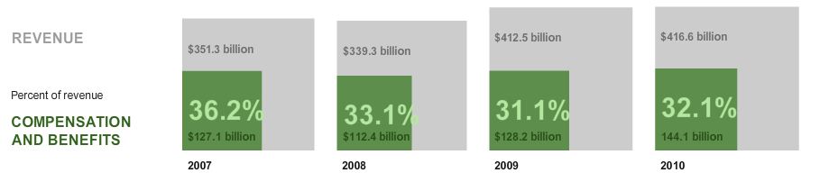 Petit graphique montrant la rémunération et les avantages à Wall Street. Comme vous pouvez voir la rémunération est demeurée à peu près le même pendant ces quatre dernières années. En valeurs nominales avec la compensation de la baisse de 2008 (127 to 112 milliards de dollars), et en valeurs relatives, baisses en 2008 (36,2% à 33,1%) et 2009 (33,1% à 31,15) puis remontée dès 2010