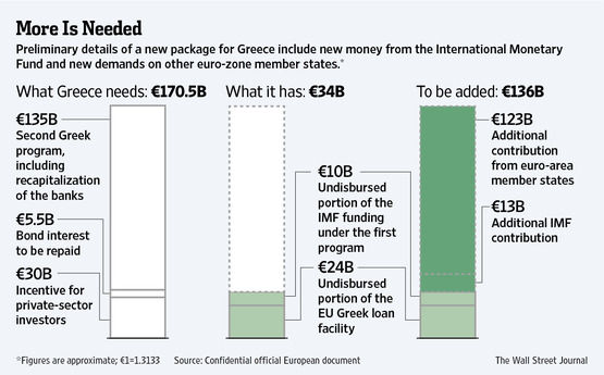 Cet échange de dette doit permettre à la république hellénique de réduire son endettement public de 100 milliards d’euros sur un total qui dépasse 350 milliards. Les banques, les assureurs et d’autres investisseurs détiennent un total de 206 milliards d’euros d’obligations grecques qui subiront une décote faciale de 53,5 % avec une perte réelle entre 73 % et 74 %.