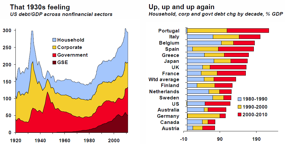Au-delà des péripéties de la banqueroute grecque, l’Europe fait face à un problème gigantesque: l’absorption des dettes publiques. Celles-ci ont désormais atteint un niveau proche de celui d’une économie de guerre. Cette situation est extrêmement grave: la dette publique exige de lever des impôts et plonge les économies dans l’austérité alors que la récession s’installe. Le manque de croissance aurait requis de faire exactement l’inverse, c’est-à-dire de stimuler l’économie par des politiques de grands travaux d’infrastructure. La théorie keynésienne instruit d’ailleurs de financer les dépenses en capital en période de récession lorsque les taux d’intérêt sont historiquement bas.