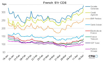 Le premier tour des élections présidentielles a lieu dans 3 jours, et pour Stephane Deo, stratégiste chez UBS, François Hollande a 75% de chances de l’emporter . Dans cette hypothèse, il y aurait des perturbations sur les marchés financiers, parce que les investisseurs n’ont pas intégré cette hypothèse dans leurs calculs de risques, affirme le blog financier américain Zero Hedge, qui observe que les CDS (credit default swap, un produit financier qui vise à offrir une couverture contre le risque de défaillance sur un produit) sur la dette française qui décrivent les risques adossés à un pays, ont recommencé à augmenter pour la première fois depuis 4 mois.