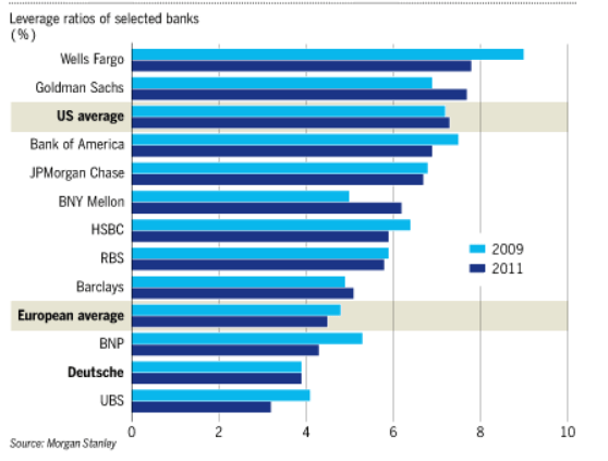 Le FMI estime de $2 200 à $3 800 Mds le « deleveraging » qui sera réalisé par un échantillon de 58 banques européennes d’ici fin 2013, soit de 6% à 10% de leurs actifs.