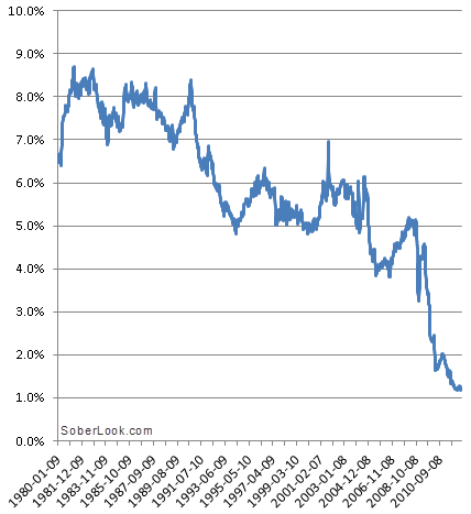 L’excellent blog Sober Look a publié ces deux graphiques qui parlent d’eux mêmes et qui sont relatifs au marché interbancaire américain. Le premier graphique montre l’évolution du marché inter-bancaire américain sur longue période qui chute après Lehmann. Le deuxième rapporte la proportion du financement par le marché bancaire au total de bilan des banques commerciales américaine qui, en parallèle, baisse très sensiblement.