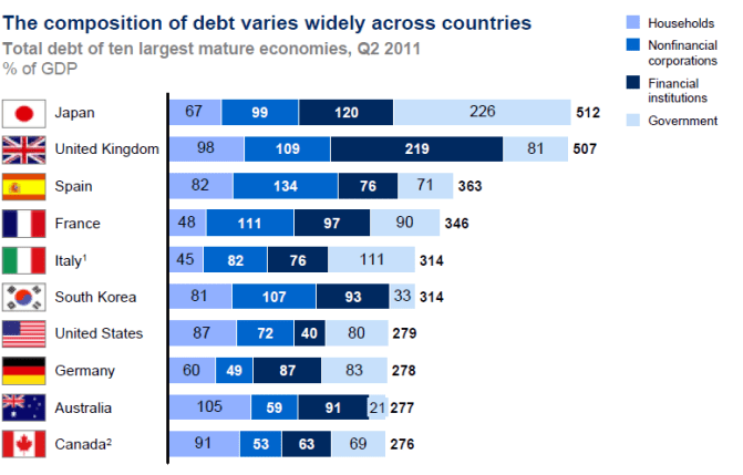 Mais un jour, comme dans la fable, la bise s’est mise à souffler fort en 2008, avec l’hiver de la crise financière. Ne laissant pas d’autre choix au secteur public, dépourvu d’excédents financiers à la suite de décennies de laxisme budgétaire, que de prendre le relais en empruntant massivement à son tour pour éviter le cataclysme général. Et voilà comment tous les pays – ou presque – de l’OCDE se retrouvent aujourd’hui face à une montagne de dettes : un excès d’endettement généralisé sans équivalent dans l’histoire, hormis les périodes de guerre ! Au Japon, la dette cumulée des ménages, des entreprises et du secteur public s’élève à 4 fois la richesse annuelle produite (400 % du PIB), au Royaume-Uni à 3 fois (300 % du PIB), aux Etats-Unis et dans la zone euro à 2 fois (200 % du PIB).
