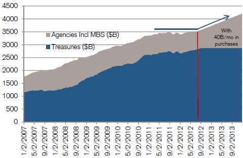 Nous retenons que la Fed envisage d’acheter 40 milliards par mois de titres hypothécaires et ceci sans indication de durée ou de date limite. Elle annonce par ailleurs qu’elle prolonge son horizon, les bas taux d’intérêt sont maintenant envisagés jusqu’en 2015.