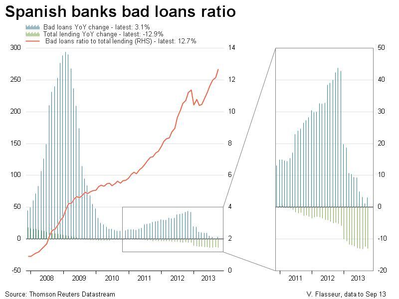 Indice de la vulnérabilité des banques, les créances douteuses ont commencé à grimper dans le bilan de tous les établissements financiers du pays après l’éclatement de la bulle immobilière en 2008. Fortement fragilisé par la fin de cette bulle, le secteur bancaire a bénéficié en juin 2012 d’un plan d’aide européen de 41,3 milliards d’euros. Dans le cadre de ce sauvetage, l’Espagne a créé une structure de défaisance, ou «bad bank», baptisée «Sareb».