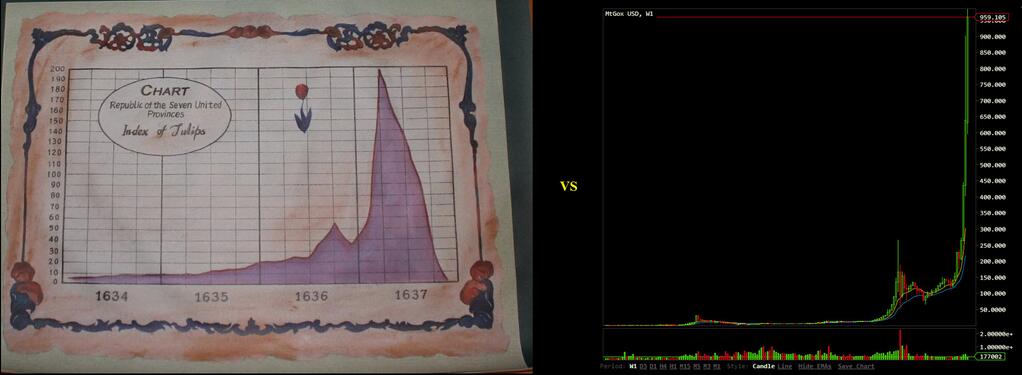 Le Bitcoin n’est adossé ni à un stock d’or, ni à une richesse tangible — présente ou future — mais seulement à une (très grosse) capacité de calculs algorithmiques (le “minage”). Sachant cela, son évolution — non proportionnelle à la croissance économique mais constituant le pur reflet du degré d’avidité des acquéreurs — est ce qui s’apparente le plus à l’hystérie spéculative des bulbes de tulipes, avec une multiplication par 100 de leur valeur en deux ans (la culmination survenant en février 1637).