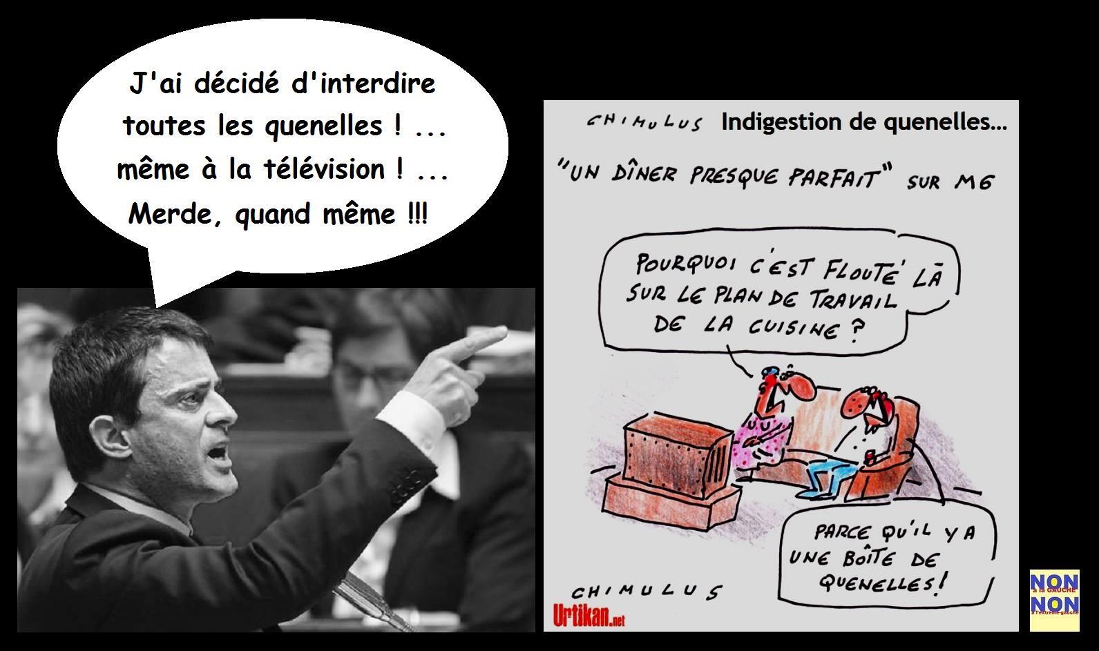 Laurent est un quenelleur fondamental, authentique, car c’est au sens profond de la quenelle que ses déclarations renvoient, les Français qui ont voté pour Hollande se font m….e. Le retournement du révolté qui, conscient de se faire m….e, retourne l’action en un geste obscène n’est pas très différent du bras d’honneur de l’automobiliste. Les apprentis fascistes vont-ils aussi interdire le bras d’honneur ? Cela ne changera rien, car, dans ce cas, au lieu de faire le bras, on fera le doigt, et si on interdit aussi le doigt, on le pensera très fort. Car, on y revient, tout se passe dans la tête des gens et le fascisme commence là, quand on veut contrôler ce qui se passe dans la tête. Nous préférons fachisme, à fascisme, car dedans il y a bien la racine « fâche » qui indique ce qui nous fâche.