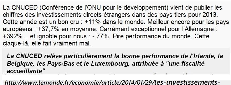 L’édition 2013 du rapport de la CNUCED livre un chiffre frappant pour la France, où les IDE se sont effondrés de 77% en 2013 par rapport à 2012, à 5,7 milliards de dollars. Au total, la CNUCED a estimé à 1.460 milliards de dollars le montant des IDE dans le monde l’an dernier, en hausse de 11%.
