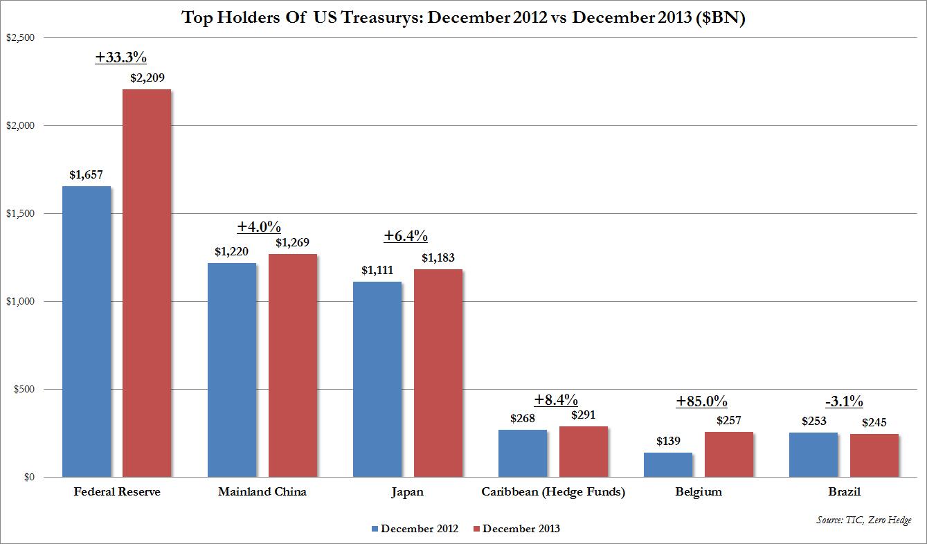 • Les chiffres officiels montrent que la Chine vend des montants record (50 Milliards en décembre 13) de Treasuries US.Permalien de l'image intégrée