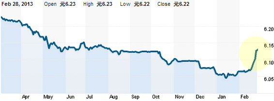 Chart: A surprisingly sharp decline in yuan recently (chart shows USD appreciating against CNY)