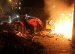 En début de soirée, les légumiers en colère se sont d’abord dirigés vers le bâtiment de la Mutualité Sociale Agricole (MSA) situé en périphérie de Morlaix sur la commune de Saint-Martin-des-Champs. Selon le maire PS de cette commune les manifestants ont alors « tout saccagé à l’intérieur ». Ils y ont ensuite mis le feu à l’aide de palettes et de pneus après avoir déversé devant le bâtiment une partie de leur cargaison de légumes invendus, des pommes de terre et des artichauts. Et ce n’était pas fini.
