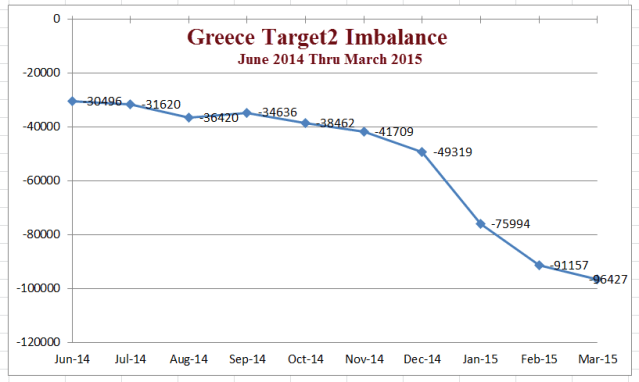 Les données de Mars en provenance de la Banque de Grece font apparaitre une hausse de 5.27 milliards d’euros des engagements de type Target2 pour la Grèce, à 96,43 milliards d’euros.