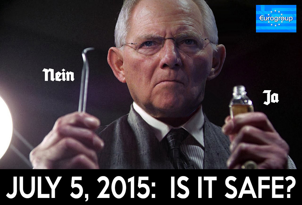 Quand bien même tout ce qui compte en Europe leur a annoncé sortie de l’euro et catastrophe pour le cas où ils voteraient Non, ils ne se prononceront pas sur une proposition de leur gouvernement de sortir de l’euro, mais sur l’acceptation ou le refus d’un certain accord avec les créanciers (« memorandum » étant le terme consacré). Bref, non pas sur une décision de sortie volontaire de l’euro, mais sur une exigence d’avoir à accepter un certain accord, sous la menace d’être sortis de l’euro de force – ce qui n’est pas la même chose.