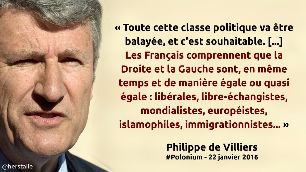 Pourtant se plaçant à contre courant de l’idéologie dominante … Notons qu’il n’est pas le seul et ne sera pas le dernier ! Défenseur d’une certaine idée de la France et de l’Europe charnelles … Il n’est pas le seul non plus ! Cet admirateur de Saint Louis (dont il a écrit une excellente biographie) ami de Vladimir Poutine, défenseur des chrétiens d’Orient, hostile au « multi culturalisme », à l’américanisation et à l’Islamisation de l’Europe, hostile au droit d’ingérence humanitaire, aux pétro monarchies du Golfe, proche des idées souverainistes … etc … Il n’est pas le seul loin de là ! La vérité est que Philippe de Villiers qui s’est retiré de la vie politique, ses origines n’ont jamais joué en sa faveur.