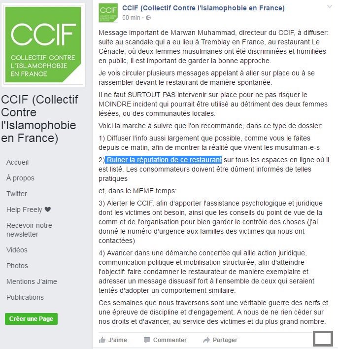 Sur les réseaux sociaux, le Collectif contre l’islamophobie en France (CCIF) affirme avoir été saisi par les deux femmes voilées et appelle les internautes à se mobiliser, en ruinant la réputation du restaurateur sur le web. «Ruiner la réputation de ce restaurant sur tous les espaces en ligne où il est listé. Les consommateurs doivent être dûment informés de telles pratiques», dénonce le collectif dans un communiqué.