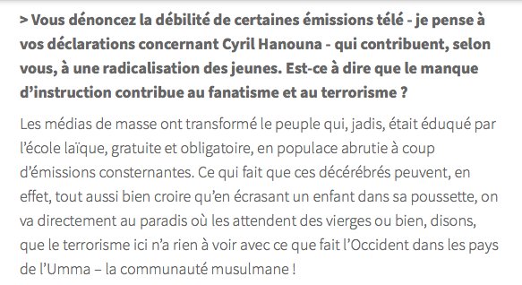 Je n’aime pas beaucoup Michel Onfray qui dit autant de choses justes que de conneries. Je préfère des gens comme Finkielkraut.
