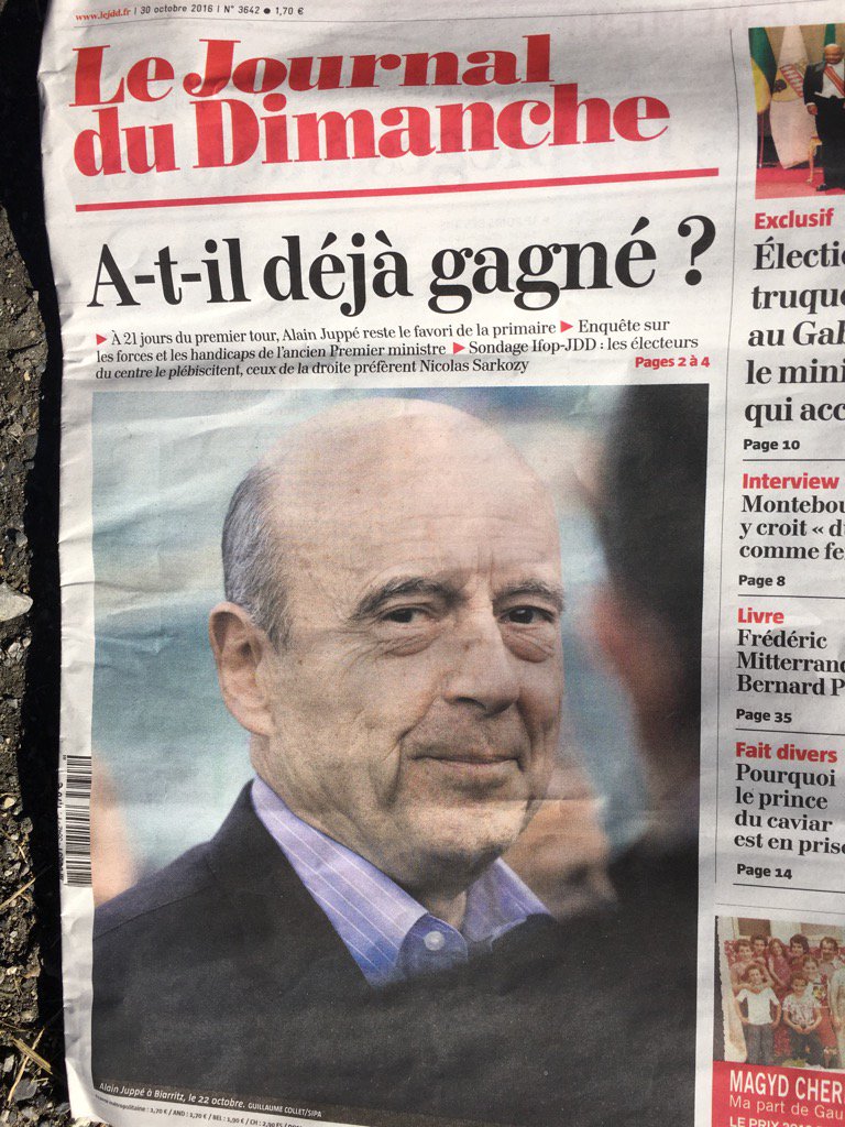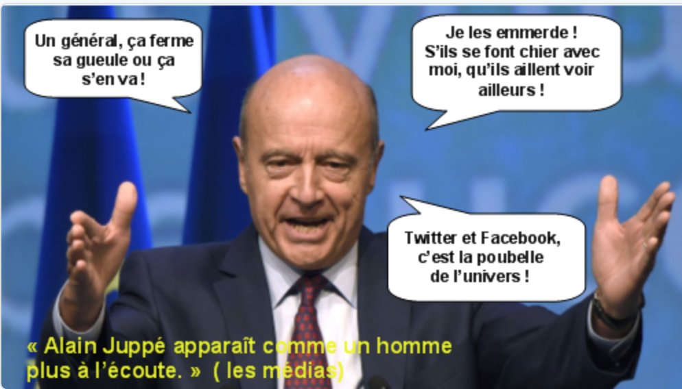 Ali Juppé ne sera jamais Président, tout ça c’est de la com, il ferait beau voir que cet ex repris de justice, obligé d’aller se cacher au Canada pour se faire oublier devienne Président UN JOUR, je n’y ai jamais cru, pas plus aujourd’hui que demain. N’oublions jamais que les « merdias » voulaient nous vendre un « Pervers sexuel » à ce Poste, n’oublions jamais que les mêmes « Merdias » nous ont vendu ensuite « François Hollande » qui a mis la France à genou. Maintenant ils vous vendent le « sosie » de Hollande en pire…