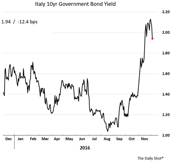 Et le marché obligataire en euro, celui qui nous intéresse à quelques jours du référendum italien ? Les rendements des emprunts italiens baissent à nouveau depuis que Mario Draghi a indiqué qu’il rachèterait tout.