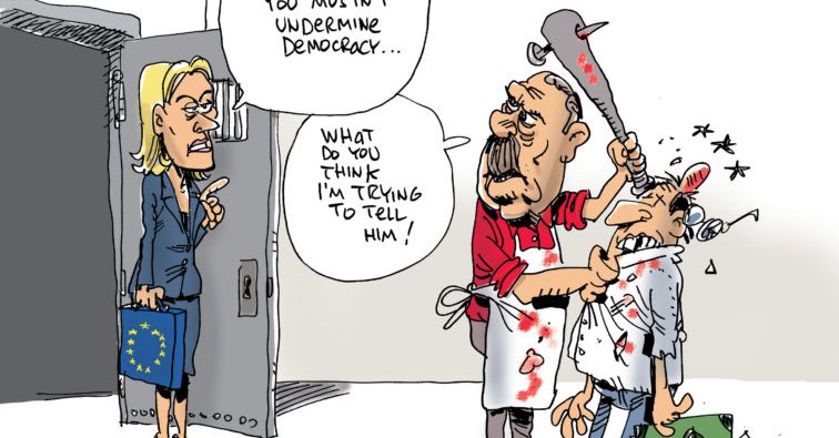 L’UE trahit les peuples et, sentant son régime menacé, licencie les peuples du rôle constitutionnel de décider de leur avenir en tuant la liberté d’expression et de choix. HAUTE TRAHISON que voilà et que soutient une phalange de politiques trans nationaux aux ordres… 5ème colonne inféodée aux lobbys et recevant son agenda du Capitol par ses relais institutionnels noyautés et chargés d’acter la scélérate besogne venue d’outre Atlantique.