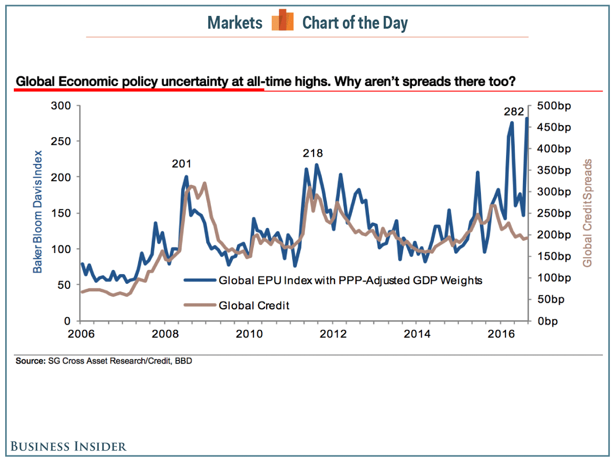 Nous avons écrit il y a fort longtemps sur ce sujet dans un article cynique intitulé « Vive les Crises », il démontrait que le négatif devenait systématiquement positif pour les marchés, car source de nouvelles largesses et assurances gratuites. Il suffit de regarder d’ailleurs les spreads sur les emprunts High Yield, ils ont comprimés, tout se passe comme si le risque avait été éliminé du système alors que de l’avis des Institutions Internationales, l’incertitude n’a jamais été aussi grande, 2017 est l’année de tous les dangers.