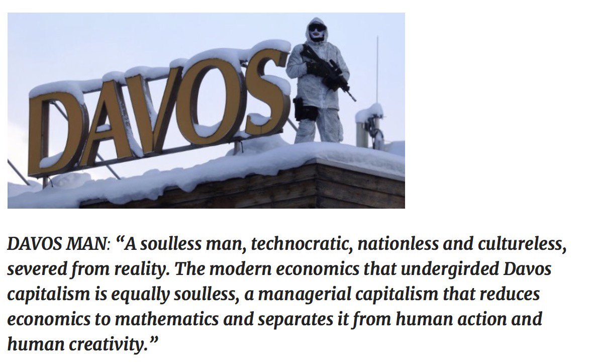 La vision du monde qui est véhiculée à Davos est une abstraction, une projection idéologique qui prend ses désirs pour des réalités et qui donc est obligée d’utiliser de plus en plus la violence, le mensonge, la propagande pour continuer de s’imposer .
