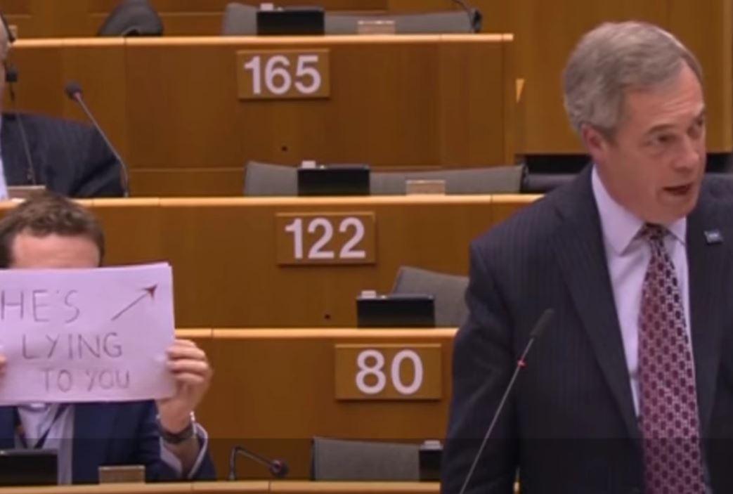 Tandis que Farage s’exprimait, un membre du Parti travailliste britannique brandissait une pancarte derrière son dos, comportant le message : «Il vous ment ». Le parti UKIP a décidé de porter plainte en relation avec cet incident.