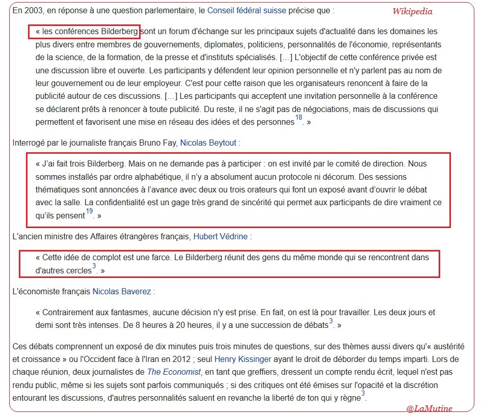 Une élite qui s’est organisée depuis longtemps dans cette optique, j’ai nommé le groupe Bilderberg, qui se réunit chaque année pendant deux jours avec les principaux dirigeants économiques et politiques de la planète- ainsi que quelques journalistes inféodés- pour discuter des « affaires du monde » et ce, dans le plus grand silence.