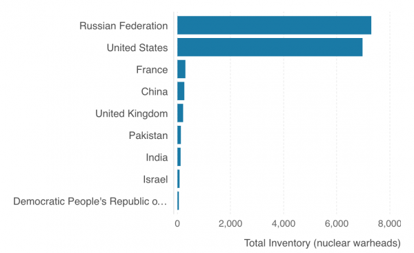 Le nombre de têtes nucléaires de chaque pays. Il s’agit d’estimations, parce que les chiffres réels sont un secret d’État. Les estimations sont fondées sur des données historiques et des « fuites » de la presse. (Source: Federation of American Scientists)