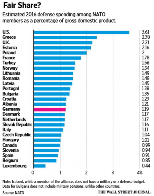 Au cours des deux dernières décennies, la contribution américaine au financement de l’OTAN est passée de 50 à 72%. En 2016, outre les États-Unis, seuls trois pays ont respecté la clause de financement de l’OTAN à hauteur de 2% de leur PIB. Belgique = 0,85%. (Le Monde)