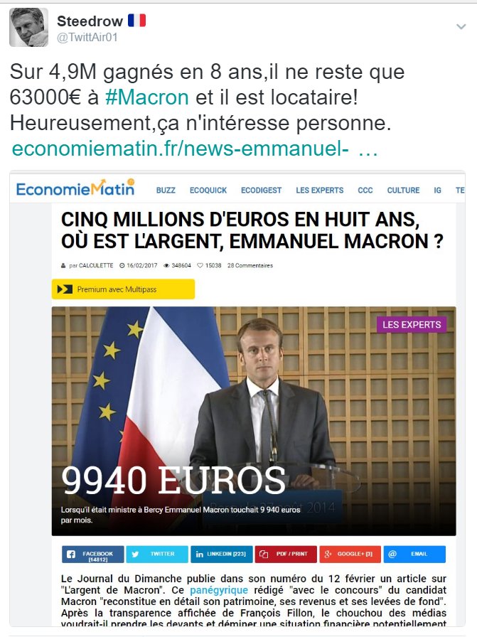 Même chose pour le patrimoine. Fillon possède un château dans la Sarthe. Et il fait de la course automobile, depuis qu’il est tout petit. On sait ce que cela veut dire. Il est né avec une cuiller en christofle dans la bouche, en plus il paraît que sa médaille de baptême est en vermeil massif, sa timbale et son rond de serviette aussi. Le patrimoine doit titiller l’imaginaire des masses que le système méprise mais dont il entend utiliser l’envie comme arme. Pensez donc ! Non content de rémunérer son épouse, cet homme a demandé un prêt de cinquante mille euros à un milliardaire sans le faire figurer sur sa déclaration de patrimoine ! Quelle noirceur !