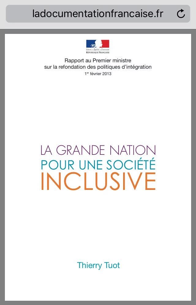 Le rapport commandé à Thierry TUOT (conseiller d’état) sous le titre : « La grande nation pour une société inclusive » a été remis au premier ministre le 11 février 2013 et a été diffusé par Matignon le plus discrètement possible.
