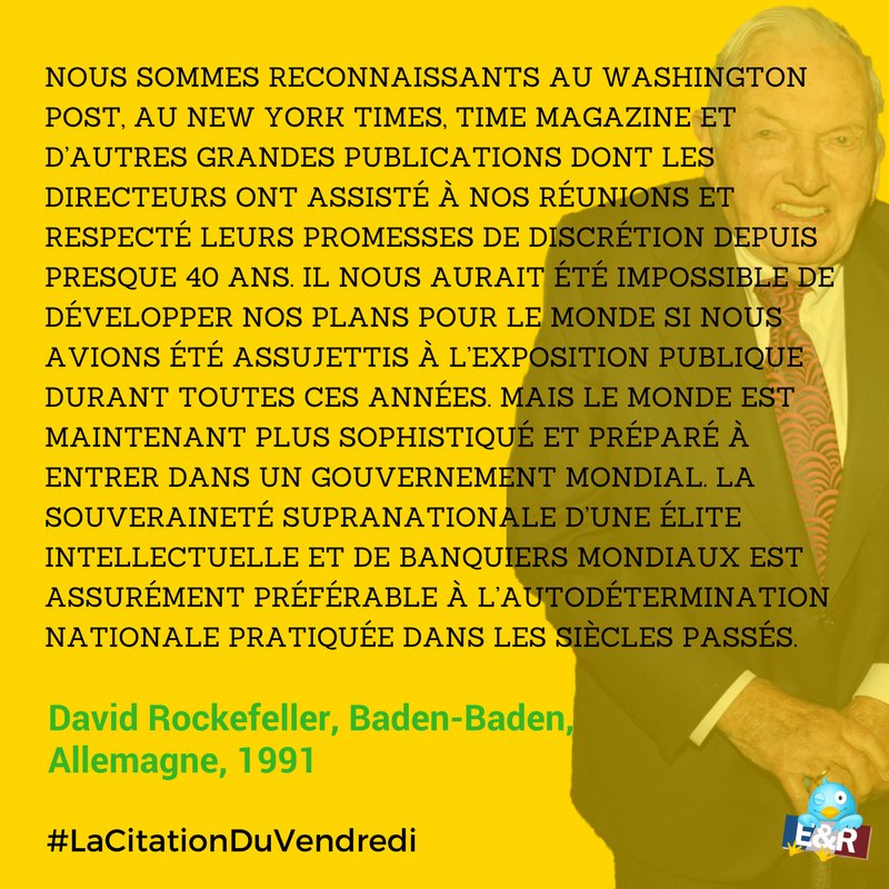 « Nous sommes reconnaissants à l’égard du Washington Post, du New York Times, du Time Magazine et d’autres grandes publications dont les directeurs ont participé à nos réunions et tenu leurs promesses de discrétion pendant près de 40 ans. Il eût été impossible pour nous de développer notre plan pour le monde si nous avions été exposés à la publicité pendant ces années-là. Mais le monde est maintenant plus sophistiqué, et prêt à marcher vers un gouvernement mondial. La souveraineté supranationale d’une élite intellectuelle et de banquiers mondiaux est certainement préférable à l’autodétermination nationale pratiquée au cours des siècles passés. »