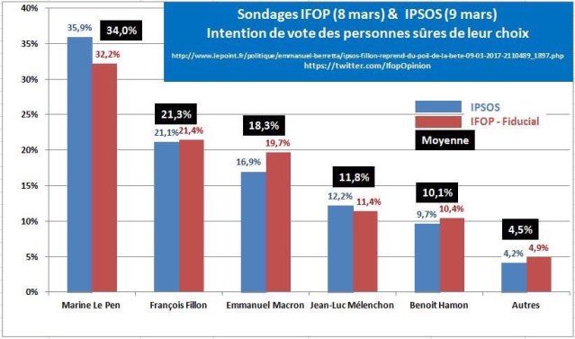 Ceci doit-il être considéré comme un signal ? Il s’agit de la parution d’un article US qui reprend des informations diffusées par Le Figaro, le 17 mars, sous la plume d’Ivan Rioufol selon lequel des “sondages secrets” circulant là où ils le doivent, “sous le manteau”, donneraient à Marine Le Pen près de 34% au premier tour (« Trêve de plaisanterie: ces bravoures d’opérette ne pèsent rien, bien sûr, devant la colère française. C’est elle qui, il y a quinze ans, avait mené par surprise Jean-Marie Le Pen au second tour de la présidentielle (16,86 % des voix). Aujourd’hui, sa fille double ou presque le score au premier tour, dans des sondages qui circulent sous le manteau… »). Suivant un des parcours habituel de la presse antiSystème, l’article US se réfère également à un article de RT-français du 17 mars, qui reprend l’article de Rioufol. L’article US est d’un site pro-Trump, TheGatewayPunfit.com le 20 mars (21 mars pour nous), suivi par ZeroHedge.com le même 21 mars, ce qui lui assure une très forte diffusion.