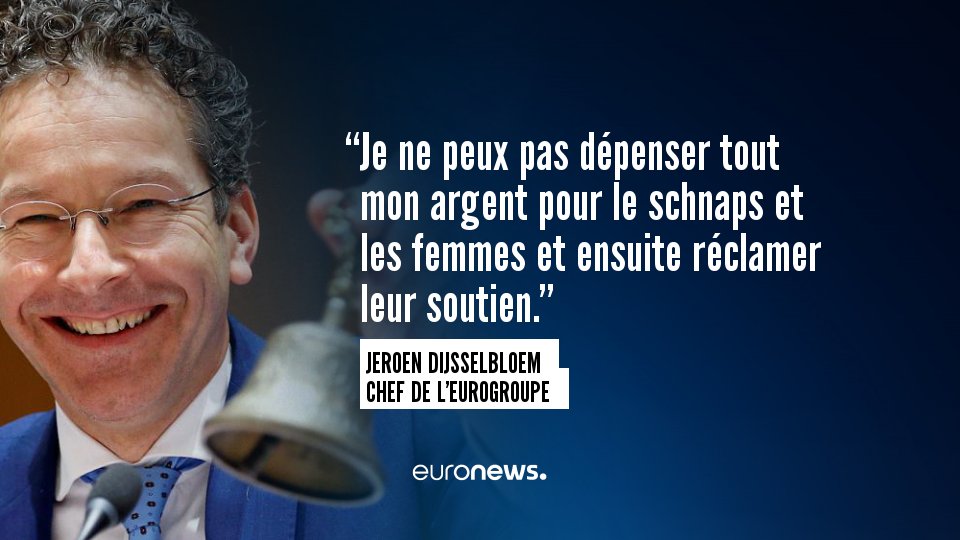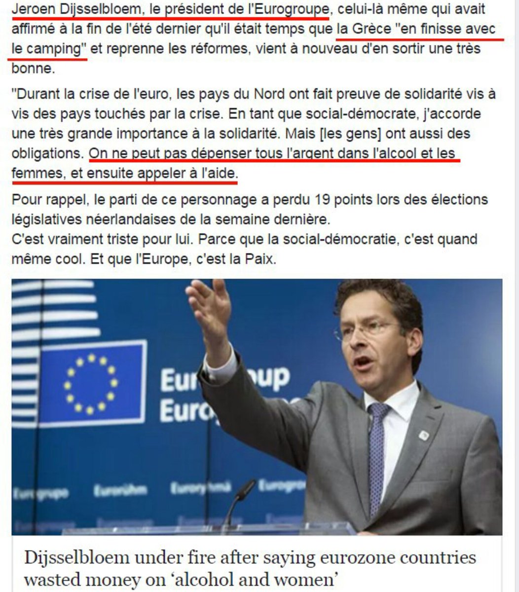 Dans un  entretien paru lundi dans le quotidien allemand Frankfurter Allgemeine Zeitung, Dijsselbloem avait déclaré : « Dans la crise de l’euro, les pays du nord de la zone euro se sont montrés solidaires des pays en crise ».« Pour moi, social-démocrate, je pense que la solidarité est extrêmement importante. Mais celui qui la réclame a aussi des devoirs. Je ne peux pas dépenser tout mon argent pour le schnaps et les femmes et ensuite réclamer leur soutien », avait-il ajouté.