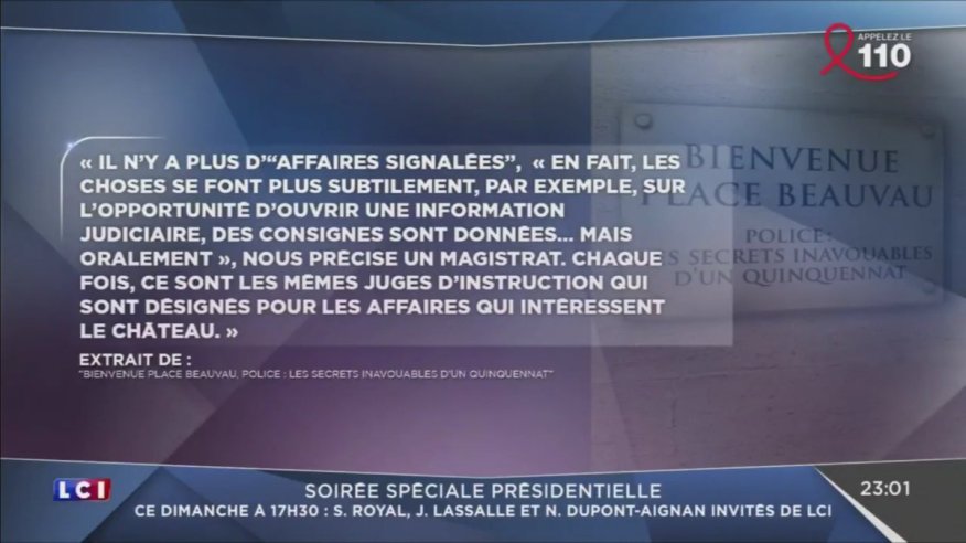 S’appuyant sur « les bonnes feuilles » de Bienvenue Place Beauvau, les secrets inavouables d’un quinquennat, publié par trois journalistes, Didier Hassoux, Christophe Labbé et Olivia Recasens, il a affirmé ceci : « C’est un livre qui, en 250 pages, explique que François Hollande fait remonter toutes les écoutes judiciaires qui l’intéressent à son bureau, ce qui est d’une illégalité totale, comment il est branché directement sur Bercy, sur Tracfin, sur les informations qui lui sont apportées en permanence, comment il est au courant des moindres faits, des moindres filatures, y compris concernant son ancien premier ministre Manuel Valls ». Et de conclure : « On cherchait un cabinet noir, on l’a trouvé, en tout cas, à travers ces allégations (…) Moi, ce soir, solennellement, je demande qu’il y ait une enquête ouverte sur les allégations qui sont portées dans ce livre, parce que c’est un scandale d’Etat ».