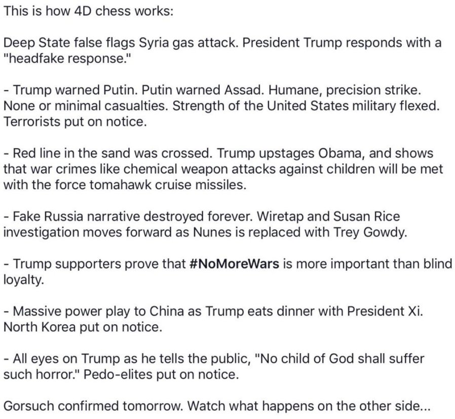 « S’il y avait quoi que ce soit de vrai, je ne sais pas pourquoi ils ne pouvaient pas attendre et examiner la situation. En 2013, il y avait des histoires semblables qui n’ont débouché nulle part, car avec un peu de temporisation, il y a eu une résistance du Congrès et de la part du peuple américain. Ils pensaient que c’était une fraude et rien de tel ne se passait, et maintenant, je ne peux pas imaginer que ce qu’ils prétendent soit concevable, car cela aide ISIS, car cela aide Al-Qaeda « .