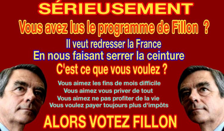 1. fillon , ce type est une tache ; d’aprés slate et un proche de fillon , celui ci aurait affirmé qu »il rendrait l’argent s’il était élu au 2em tour ; cette saloperie a volé les français , s’est posé en victime pendant des semaines pour reconnaitre , enfin , qu’il était bel et bien coupable de ce qui lui été reproché ; et mossieur se permet de faire du chantage ? ce type a une mentalité pourri et j’espère qu’il va se prendre une veste au premier tour ; qu’il dégage et qu’on en entende plus parler ;
