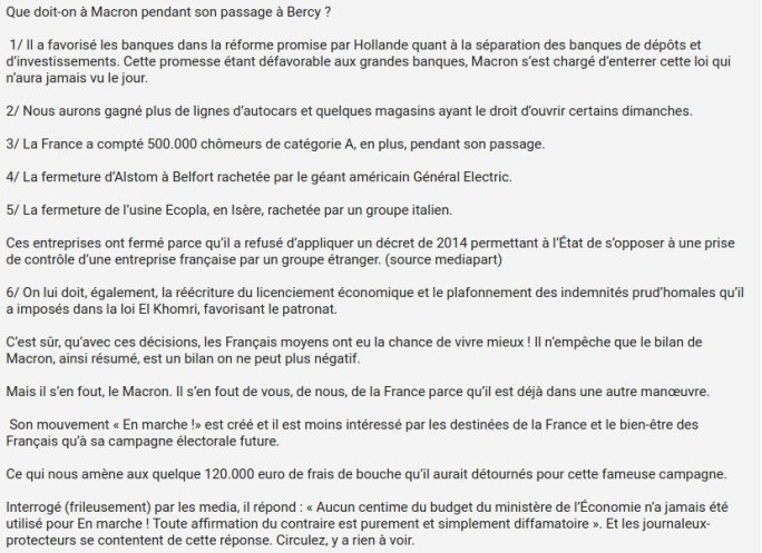 On mesure le chemin parcouru, il va du mensonge à l’hypocrisie puis au cynisme. Souvenez vous en car nous vous en reparlerons: on est toujours puni par ou l’on pêche, Macron sera puni par la finance, mais c’est une autre histoire, pour le futur. Mais prenez date.