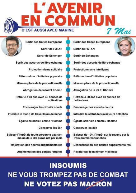 Je ne suis pas d’accord je pense que Madame Lepen a fait une bonne campagne de terrain mais elle est bien seule le camp des patriotes est divisé : les catholiques avec Fillon le roi de l’intox, Dupont Aignan droit dans ses bottes et surtout supporté par des cadres un pied dedans un pied dehors affaire de boutiquier, Asselineau qui passe son temps à dire beaucoup de mal de Mme Lepen et du FN du Charles Pasqua en puissance, la droite orpheline qui passe son temps à se lamenter et se pince du nez quand ils parlent de MLP et du FN « trop à gauche » pas assez libéral avec les médias qui font un formidable boulot de destruction massive de MLP avec une audience publique qu’aucun média alternatif arrive à la cheville sans parler de la droite Européiste et la gauche toujours aussi maligne avec un Macron vendu comme anti système et un Mélanchon populiste patriote.