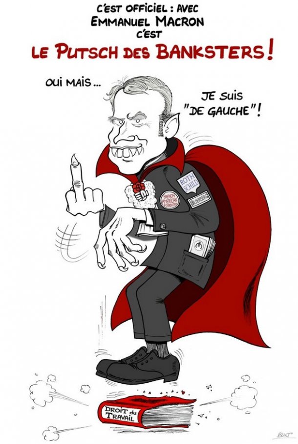Emmanuel Macron que ses soutiens omniprésents dans les médias présentent comme « un homme libre et indépendant » est en réalité un pur produit standardisé du système : le clone de François Hollande. Rappelons à ces montreurs de marionnette que leur « homme libre et indépendant » refuse toujours de publier la liste des contributeurs financiers à sa campagne électorale. Est-ce à dire qu’il aurait bénéficié de millions d’euros de plusieurs représentants du système pour monter son spectacle et entrer en scène médiatique en jouant le candidat anti-système ? Car Macron ne devint pas dès le mois de mai 2012 conseiller économique de François Hollande puis ministre de l’Economie par un travail personnel important et innovant en matière économique. Il entra à l’Elysée sur les recommandations appuyées des vieux briscards des réseaux du clan élitiste et arrogant des anciens des grandes écoles et de la grande finance capitaliste. De Jacques Attali à Alain Minc en passant par les inévitables salonards parisiens comme Bernard-Henri Lévy et quelques milliardaires à l’image de Pierre Bergé, les entremetteurs ne manquent pas, tous liés aux cercles atlantistes. De 2011 aux élections présidentielles de 2017, ceux-ci n’ont cessé de border son parcours avec le concours, plus ou moins déclaré, des représentants au pouvoir de la caste des grands propriétaires privés de l’économie. Peu importe qu’ils soient membres de Les Républicains ou « socialistes», le principal étant d’assurer la continuité du système. Son parcours a donc un bilan que les médias officiels n’évoquent pas et qu’il est donc nécessaire de rappeler.