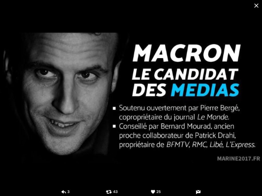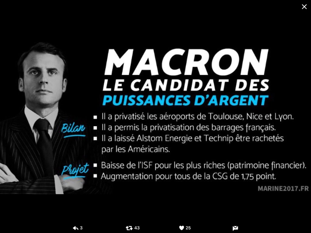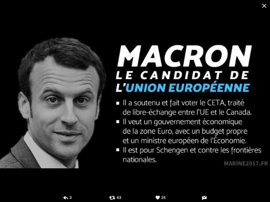 L’importante campagne de communication et de désinformation orchestrée par l’équipe d’Emmanuel Macron dissimule les conséquences du programme politique de candidat de la grande finance : la dislocation du contrat social français et la continuité de la politique belliciste de Bruxelles contre la Fédération de Russie et la paix. Lors du premier tour des élections présidentielles, l’objectif recherché par l’équipe et les soutiens d’Emmanuel Macron fut de mettre François Fillon hors course sans mener de campagne particulière contre Marine Le Pen. Le but recherché était alors de réorienter le vote des électeurs LR et du centre vers le candidat mis en scène par François Hollande et les milieux atlantistes. D’autre part, ces derniers laissèrent Benoit Hamon mener sa campagne sous les couleurs du parti « socialiste » avec le seul objectif de faire échec à Jean-Luc Mélenchon. François Fillon, seul candidat qui aurait pu mettre en échec Macron, mis hors de course, la communication change d’orientation pour le second tour. Après « la rupture » de Nicolas Sarkozy et « le changement maintenant » de François Hollande, il ne reste plus aux dirigeants « socialistes » qu’à laisser continuer de diaboliser le Front national par ses habituels détracteurs tout en présentant Emmanuel Macron comme « l’homme du renouveau ». Nouveaux visages et recette éprouvée pour la même vieille politique.